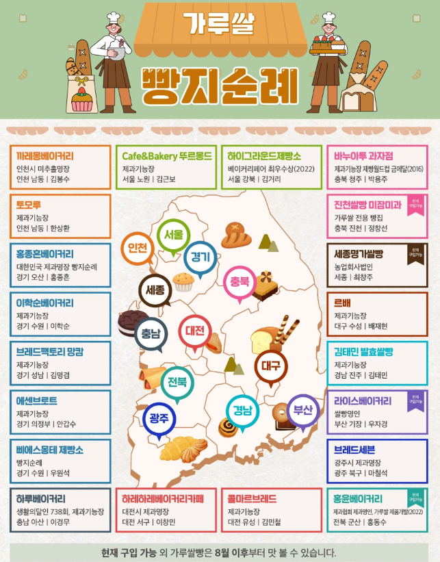 농촌진흥청은 바로미2의 가공적성을 분석하여 빵과 과자를 만들기에 양호하다는 것을 검정했습니다. 그리고 2022년에 우리쌀빵 기능경진대회를 개최하여 232개의 가루쌀 레시피를 개발했습니다. 더불어 지역 제과 제빵 업체 20곳을 선정해서 업체당 2종씩 총 40종의 신메뉴 개발을 지원합니다. 그렇게 가루쌀 빵을 맛볼 수 있는 '가루쌀 빵지순례' 지도를 공개했는데요. 현재는 충북 진천의 진천쌀빵 미장미과, 세종시의 세종명가쌀빵, 부산 기장의 라이스베이커리, 전북 군산의 홍윤베이커리에서 구입할 수 있습니다. 지도에 있는 다른 제과점은 2023년 8월 이후부터 맛볼 수 있다고 합니다. 골고루 분포된 지역에, 각 빵집마다 새로운 메뉴가 2가지씩 공개된다니 빵을 좋아하는 사람들은 한 곳씩 방문해 보는 재미도 있을 것 같습니다.