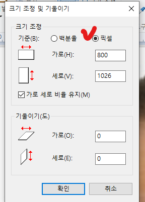 크기 조정에서 기준을 <픽셀>으로 선택한다.