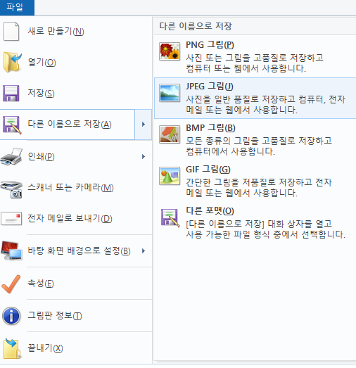 [파일] - [다른 이름으로 저장] - [JPEG 그림]을 선택한다.