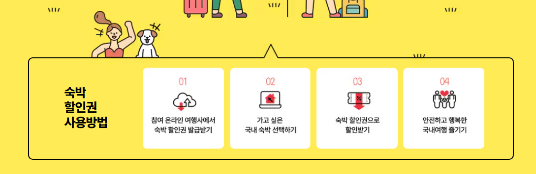 숙박페스타 참여 온라인 여행사에서 할인권을 발급받고, 원하는 국내 숙박시설에 예약하면서 할인권을 사용하면 된다.