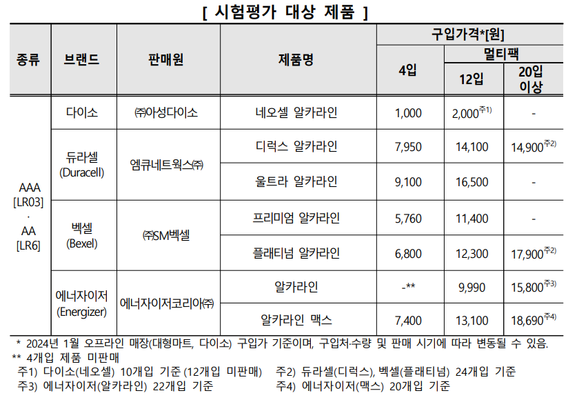 한국소비자원이 시중에 유통 중인 알카라인 건전지 14개 제품의 지속시간 / 안정성 / 경제성 등을 시험평가했다.